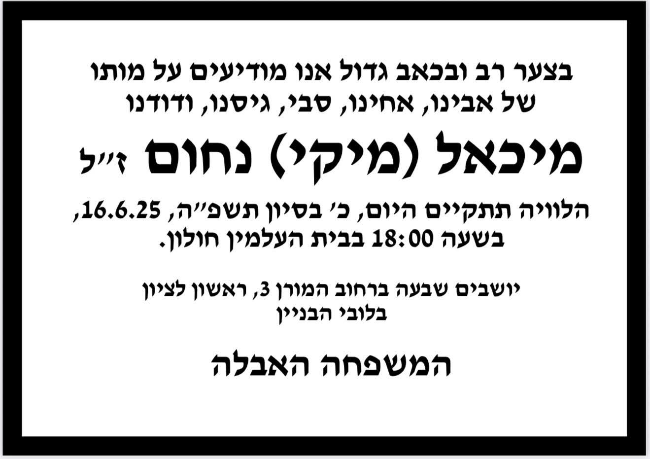 הותר לפרסום: שמו של הרוג נוסף מהפגיעה בבת ים – מיכאל (מיקי) נחום, בן 61 ואב לארבעה