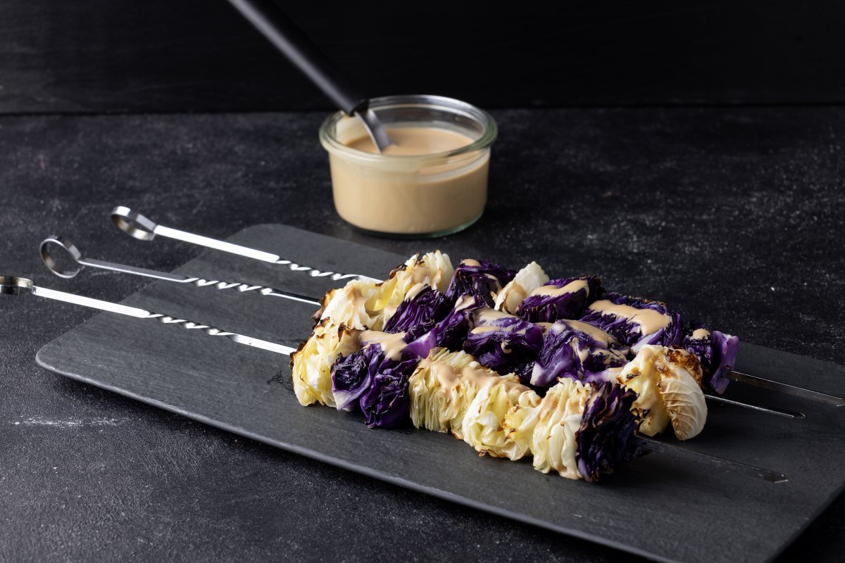 5. מניחים את שיפודי הכרוב על צלחת הגשה, מזלפים מעל רוטב טחינה ומגישים.