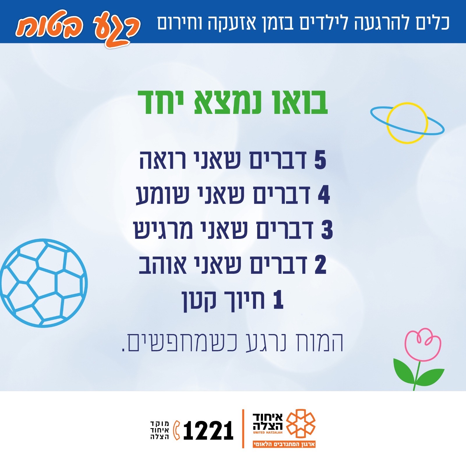 “חמש-ארבע-שלוש-שתיים-אחת” – תרגיל מיקוד חושי: 5 דברים שרואים, 4 ששומעים, 3 שמרגישים, 2 שאוהבים, ונשימה אחת עמוקה.