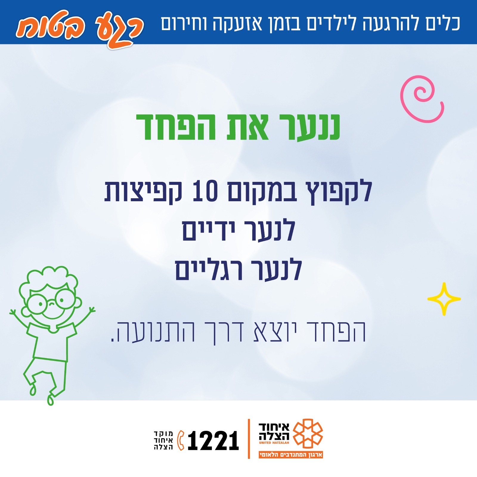 תנועה לפריקת מתח – לקפוץ במקום, לנער ידיים ורגליים, להזיז את הגוף כדי לשחרר פחד.