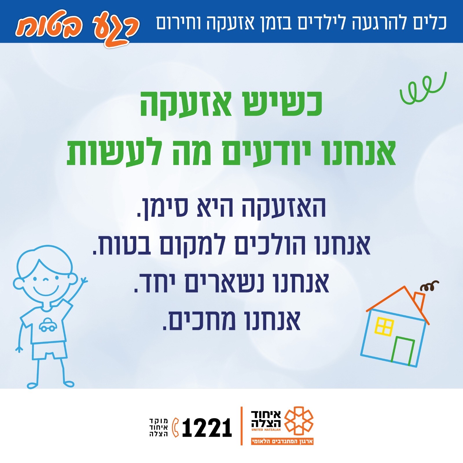 בארגון מדגישים כי האזהרה היא סימן לפעולה – לא לסכנה מיידית, וכי הליכה מהירה למקום מוגן יחד, תוך שידור מסר של שליטה וביטחון, מפחיתה משמעותית את רמת החרדה אצל ילדים.