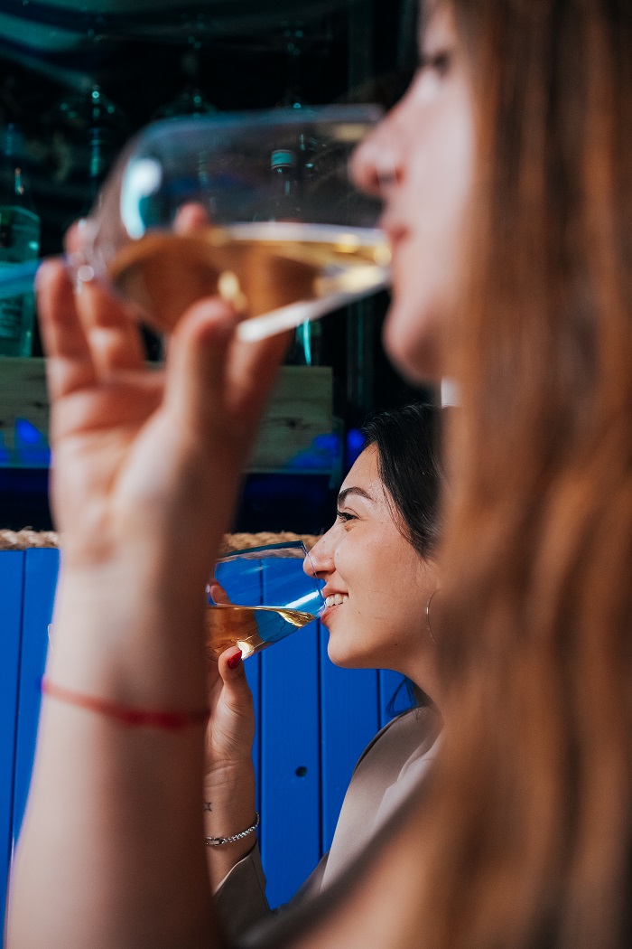 בתפריט יש מגוון עשיר של סוגי יין, שלל סוגי אוזו ממגוון הטברנות היווניות המובילות וקוקטיילים ים-תיכוניים מרעננים.